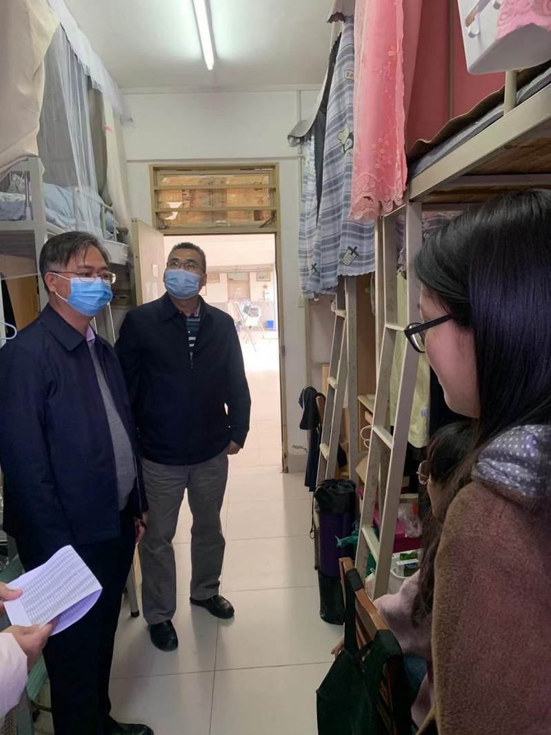 袁东卫书记一行深入28栋研究生宿舍,在一楼详细了解研究生宿舍疫情防控、公寓物业管理和保障服务工作情况。随后从9楼开始逐层走访。