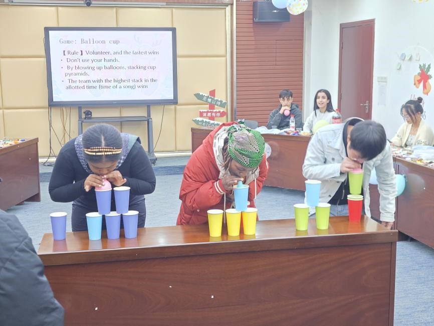 本次联谊茶话会为大家准备了特大份的蛋糕。中外同学完成了Ballon Cup和 Separation Anxiety两个小游戏并一同分享蛋糕,过程趣味纷呈。